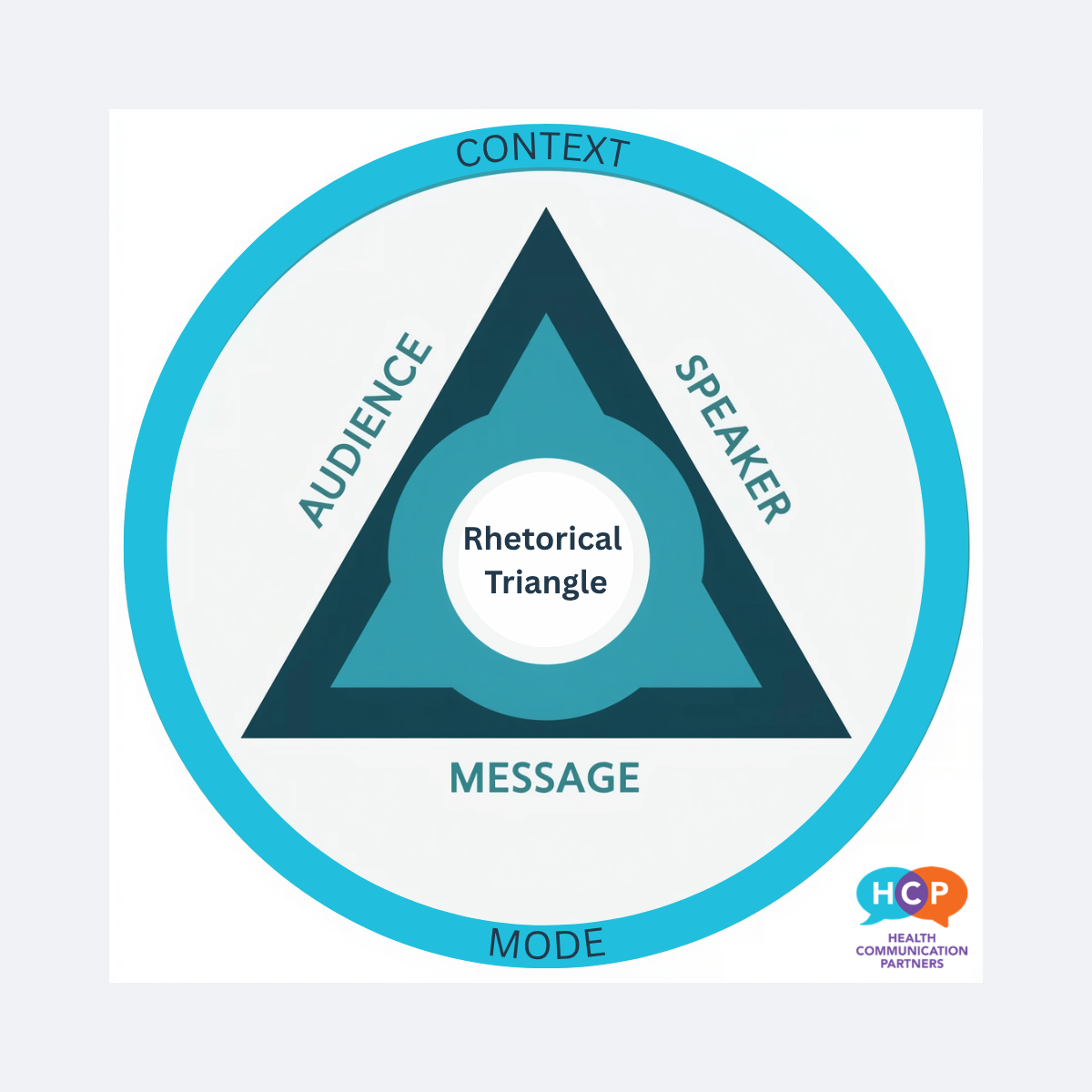 You may have seen something called the rhetorical triangle. This is typically the three elements first identified by Aristotle as central to spoken communication: audience, speaker, message. These are also sometimes shown as logos, ethos, and pathos. These three elements, Aristotle argued, are the basis of a formal conversation. Frequently, that triangle is pictured with a circle around it. That circle portrays context, and mode.