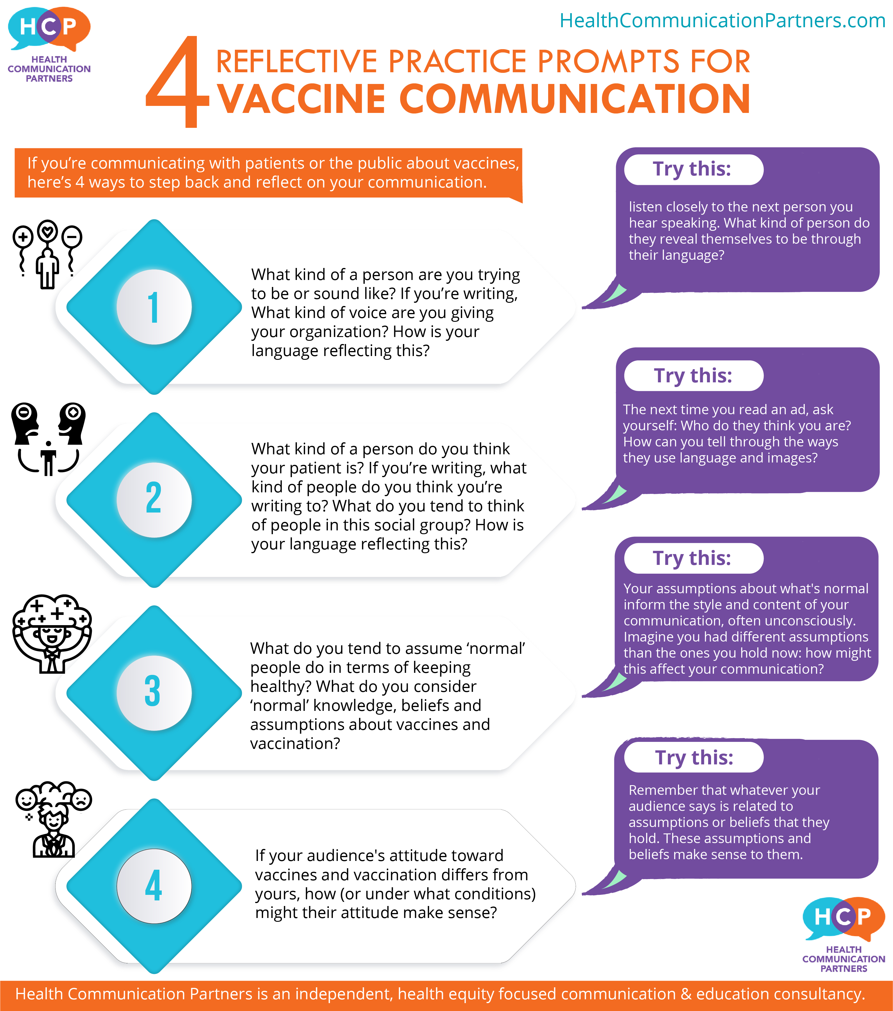 So I’m offering you 4 prompts for reflective practice–and some hints!–in the form of an infographic. It’s quick to read and perfect for sharing. These prompts invite you to think about what’s beneath the hood of your communication about vaccines – COVID-19’s vaccines, and any others. Click here to download.