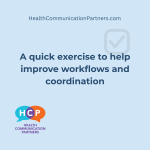 A quick exercise to help improve workflows and coordination February 20, 2026 by Anne Marie Liebel Here at Health Communication Partners, one of the ways we help organizations is … [Read more...] about A quick exercise to help improve workflows and coordination